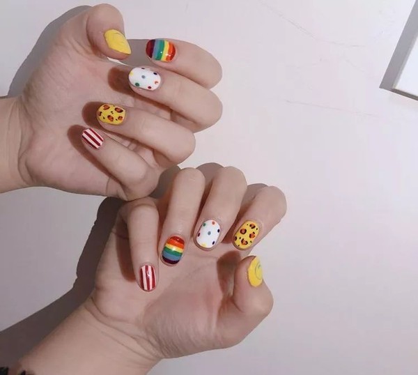 指甲上画彩虹也成为了泫雅风美甲的另一代表款式,鲜亮的颜色让指尖的辨识度非常高,彩虹元素和波普波点搭配起来活力满满,在外出度假的时候,自拍也会更抢眼哦~