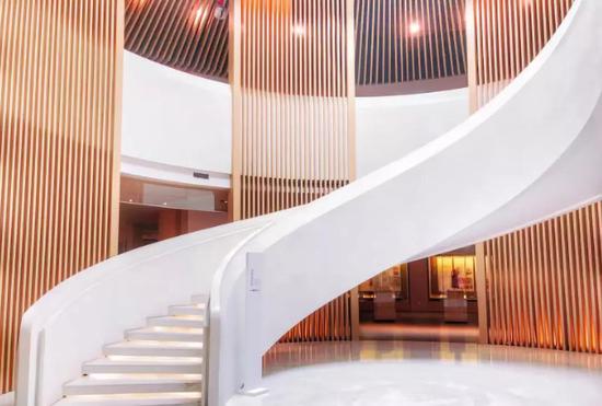 大厅中央的楼梯,像一条白色的绸缎,优美、引人入胜,游客***姐在这里尽情自拍。