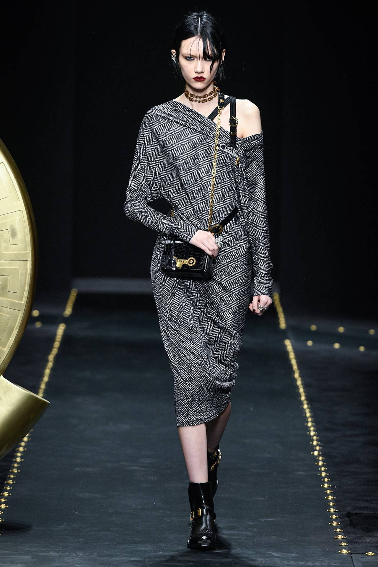 在Versace秀场上,她的妆容依然冷艳夺目。但是,此次她身穿单侧露肩的连衣裙不同于Chloe秀场上的干练硬朗,反倒展现了她骨感的身材。黑色皮靴与黑金锁头包似乎更符合她原本的“哥特暗黑风”气质。