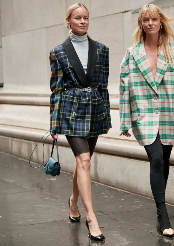 搭配英伦格纹的廓形西装,仿佛削弱了骑行短裤原有的性感运动而使整体更加优雅知性。