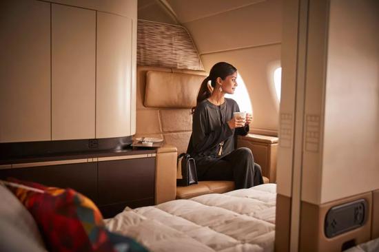 其380的头等舱(还不是顶配的“空中官邸”)早早就设置了彼此独立的起居榻和睡床。