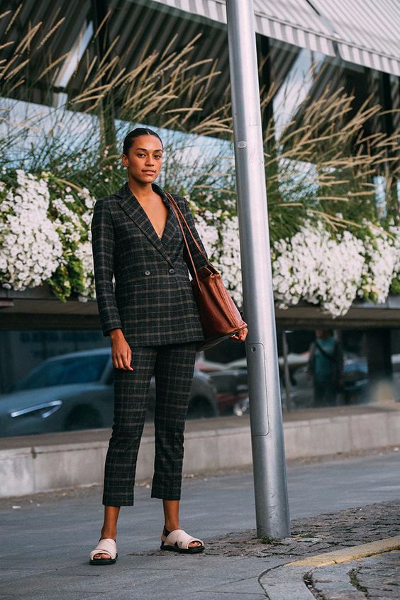 流行的格纹套装也赶快搭配“奶奶凉鞋”穿起来,办公室里最知性时髦的就是你。