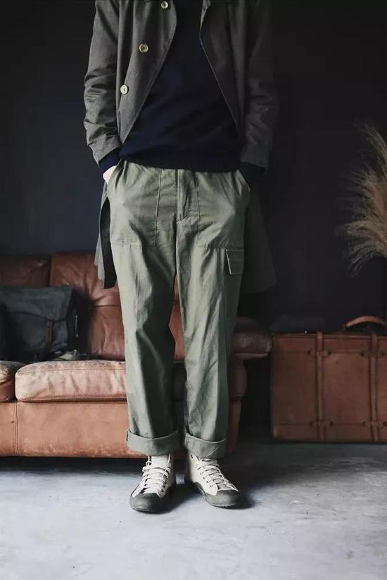 Baker pants有一定的风格,又名fatigue pants。本来是热带地区工服着装,一直到越战时期才被纳入至美军军服之列。 大多数Baker pants都加强了大腿位置的设计,把口袋一直向下延伸,所以这是一个很好的标志,你一看就知道是Baker pants。这些裤子有各种颜色,都有独特的风格,但是它们和其他军用裤或工装裤有什么区别呢?就是两边贴合大腿的深口袋和人字形斜纹面料。