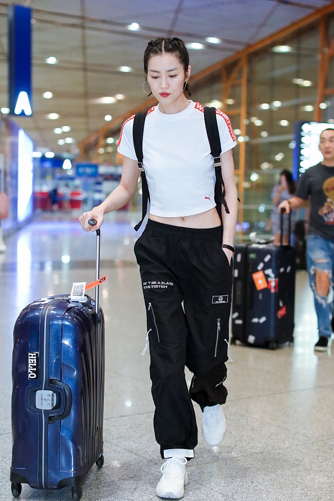 张天爱也是很爱运动风,宽白条阔腿运动裤把整个look都变时髦了不少,配上简单的字母Tee就能赢很大了。