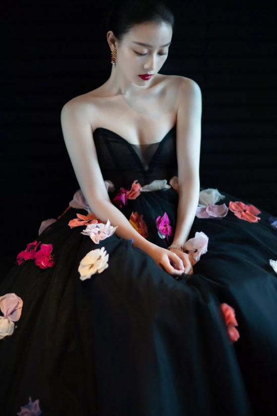 每一次出席活动时,倪妮的造型都十分惹眼。这一套花朵点缀的黑色抹胸裙优雅俏皮,化身性感的森林小精灵。